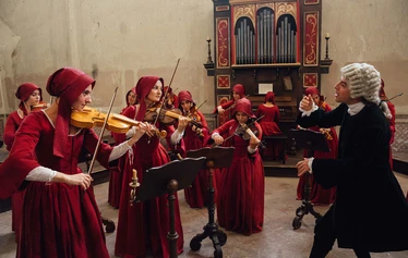 Pietan orkesteri on kuulu kautta Euroopan, onhan orpokoti kouluttanut muusikoita jo satoja vuosia. Orpotytöt soittavat kirkon parvella ristikon takana, jotta äveriäs seurapiiriyleisö voi paremmin keskittyä musiikkiin.